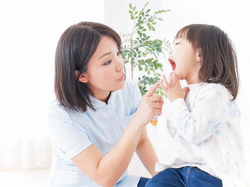 緊急性のある場合を除いて最初から治療はせず、生活習慣の改善や練習から始めます。お子様ご本人が自らの意思で口を開けて、治療を乗り越えていこうという気持ちを育てます。